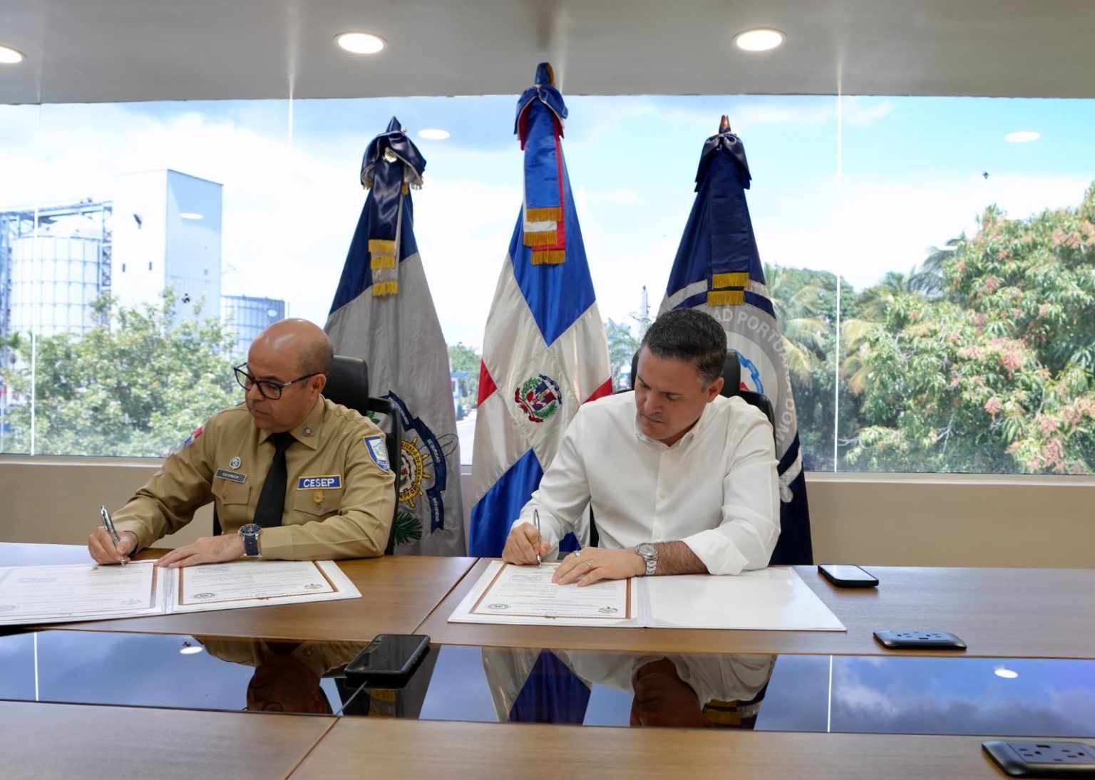 El director ejecutivo de la Autoridad Portuaria Dominicana (APORDOM), Jean Luis Rodríguez, acompañado por el director general del Cuerpo Especializado de Seguridad Portuaria (CESEP), contralmirante Henry Antonio Guzmán Taveras, ARD, firmaron y entregaron la certificación para la Protección de Buques y las Instalaciones Portuarias (Código PBIP), al fondeadero, terminal turística y de cruceros Samaná Bayport, al nordeste de la República Dominicana.